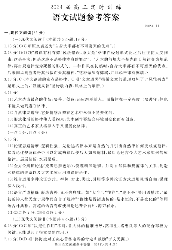 山东省枣庄市滕州市2024届高三上学期期中考试语文答案
