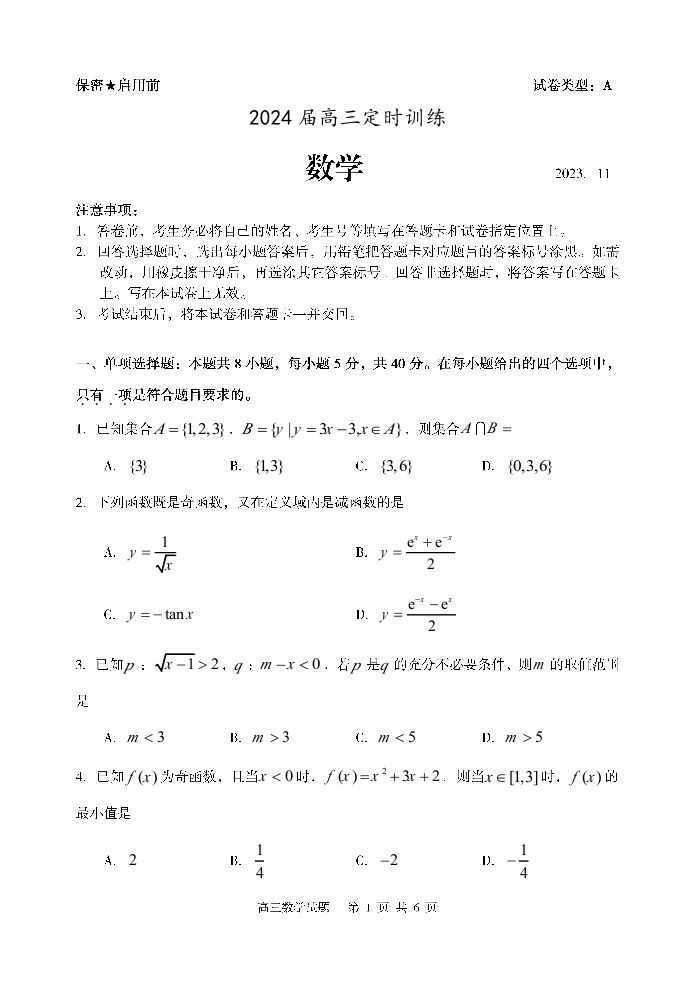 山东省枣庄市滕州市2024届高三上学期期中考试数学