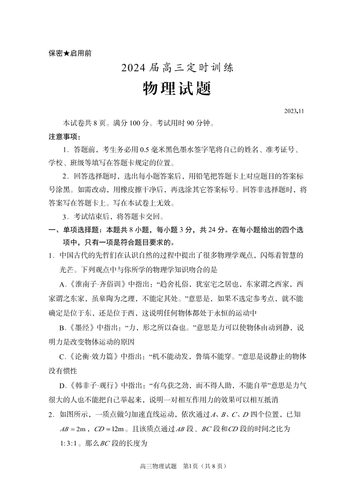 山东省枣庄市滕州市2024届高三上学期期中考试物理