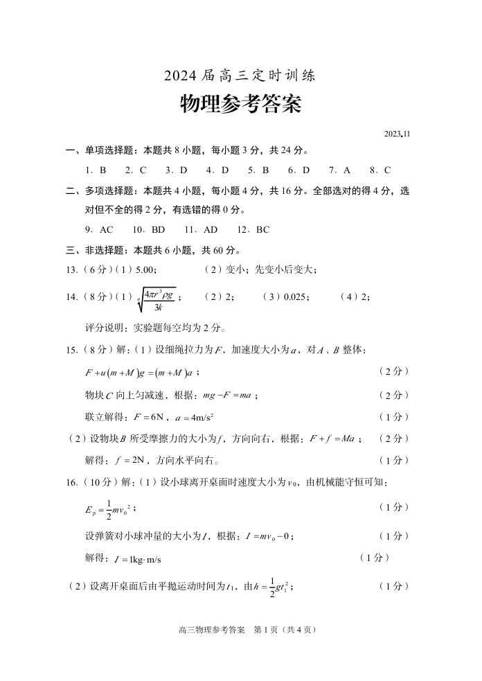 山东省枣庄市滕州市2024届高三上学期期中考试物理答案