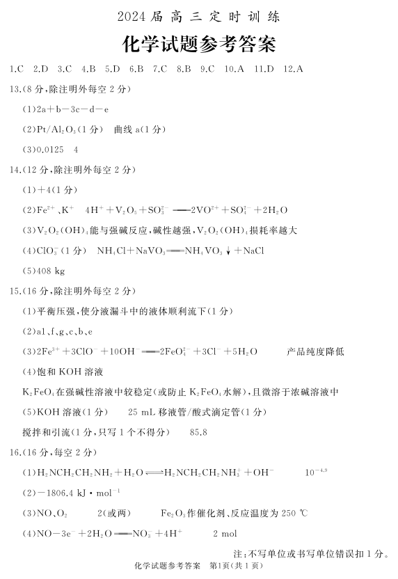 山东省枣庄市滕州市2024届高三上学期期中考试化学答案