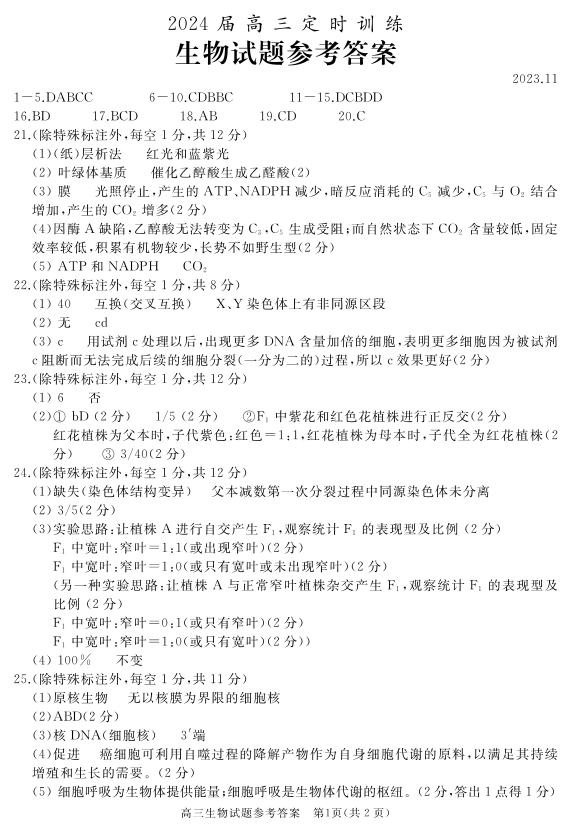 山东省枣庄市滕州市2024届高三上学期期中考试生物答案