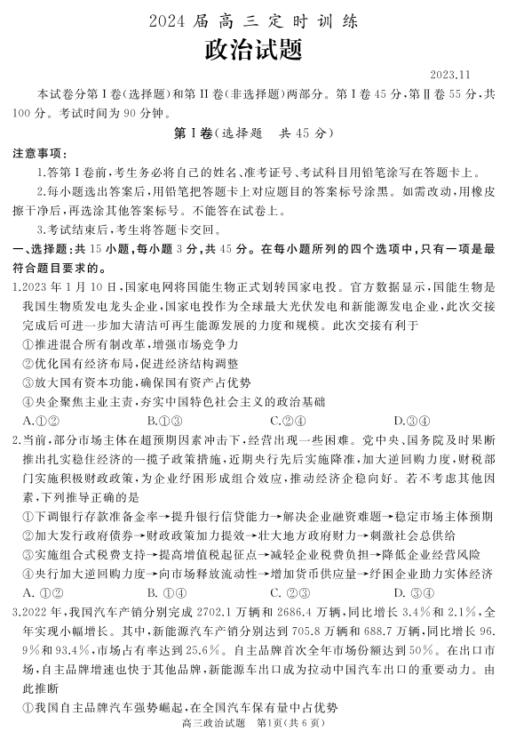 山东省枣庄市滕州市2024届高三上学期期中考试政治