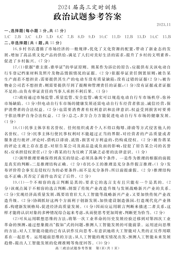 山东省枣庄市滕州市2024届高三上学期期中考试政治答案