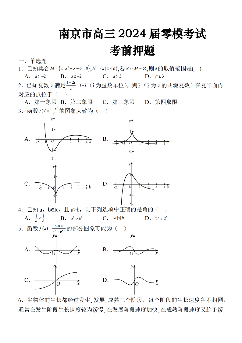 江苏省南京市2024届高三上学期零模考试数学+答案