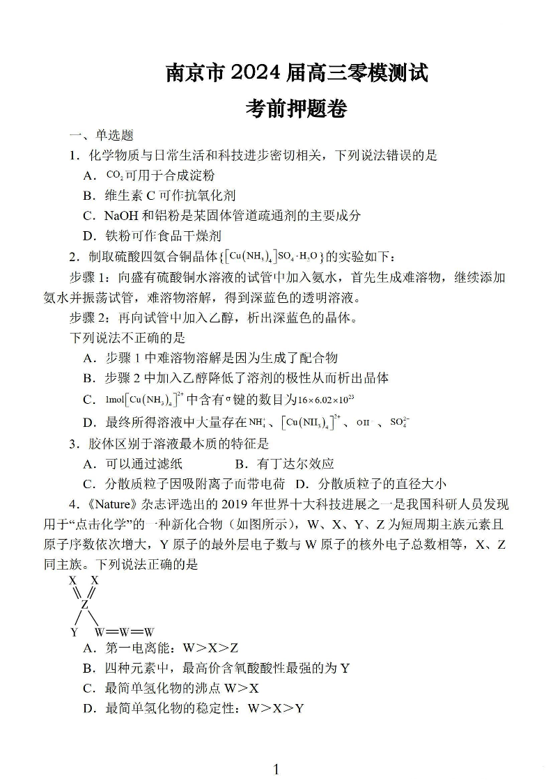 江苏省南京市2024届高三上学期零模考试化学+答案