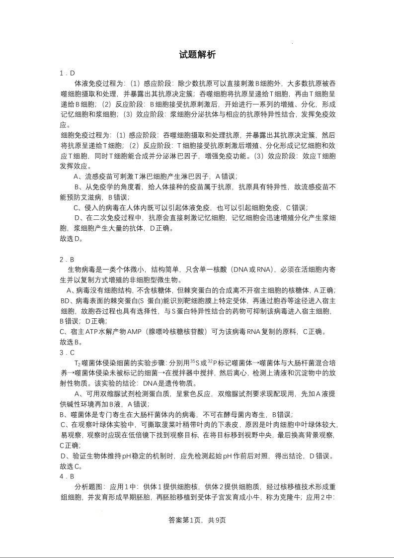 江苏省南京市2024届高三上学期零模考试生物答案