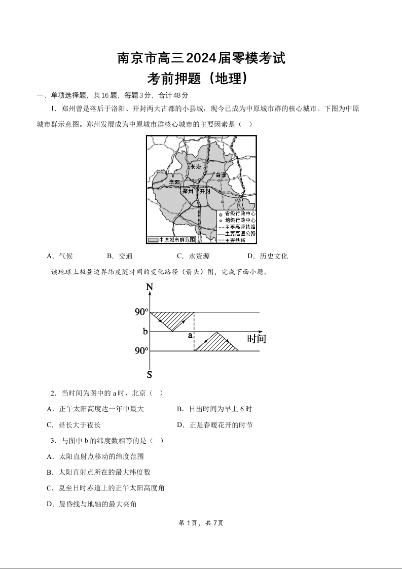 江苏省南京市2024届高三上学期零模考试地理