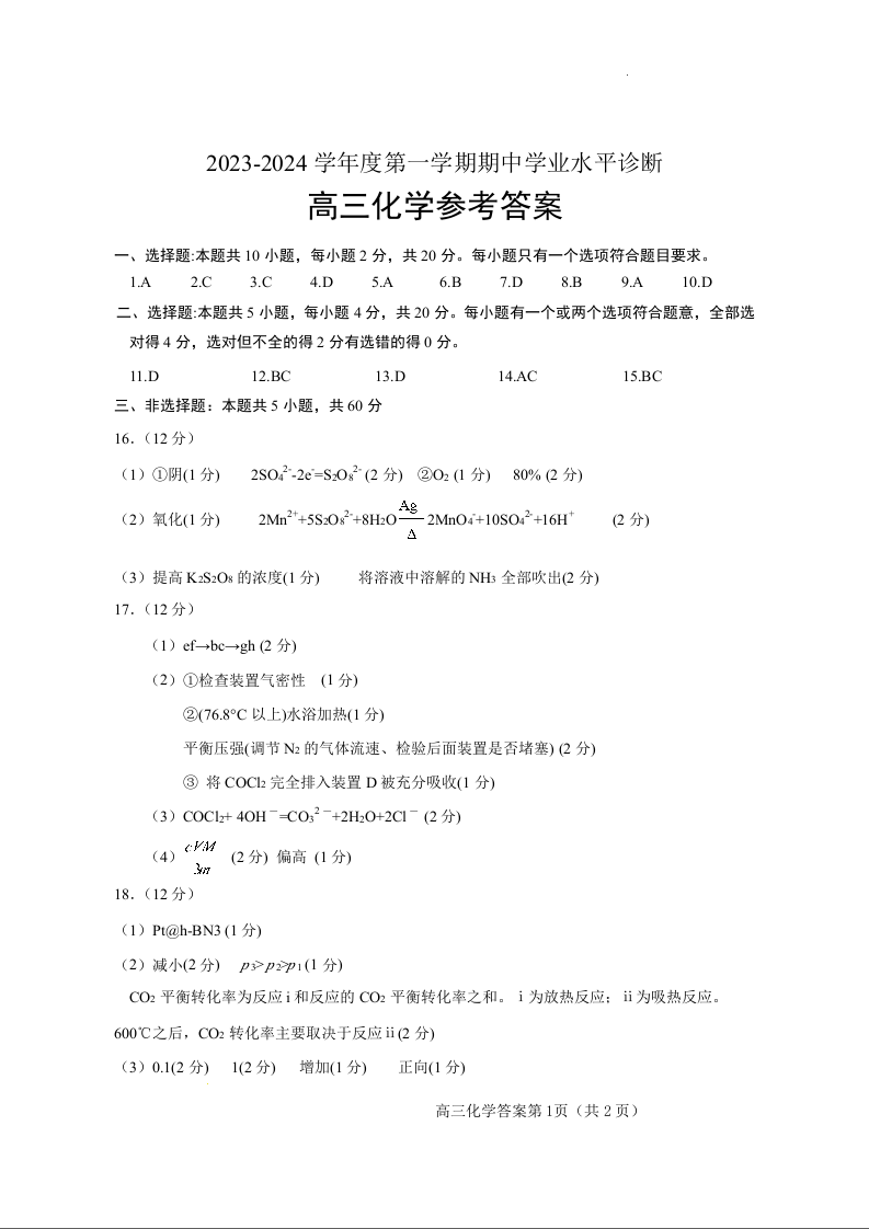 山东省烟台市2024届高三上学期期中考试化学答案