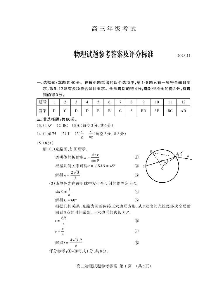 山东省泰安市2024届高三上学期期中考试物理答案