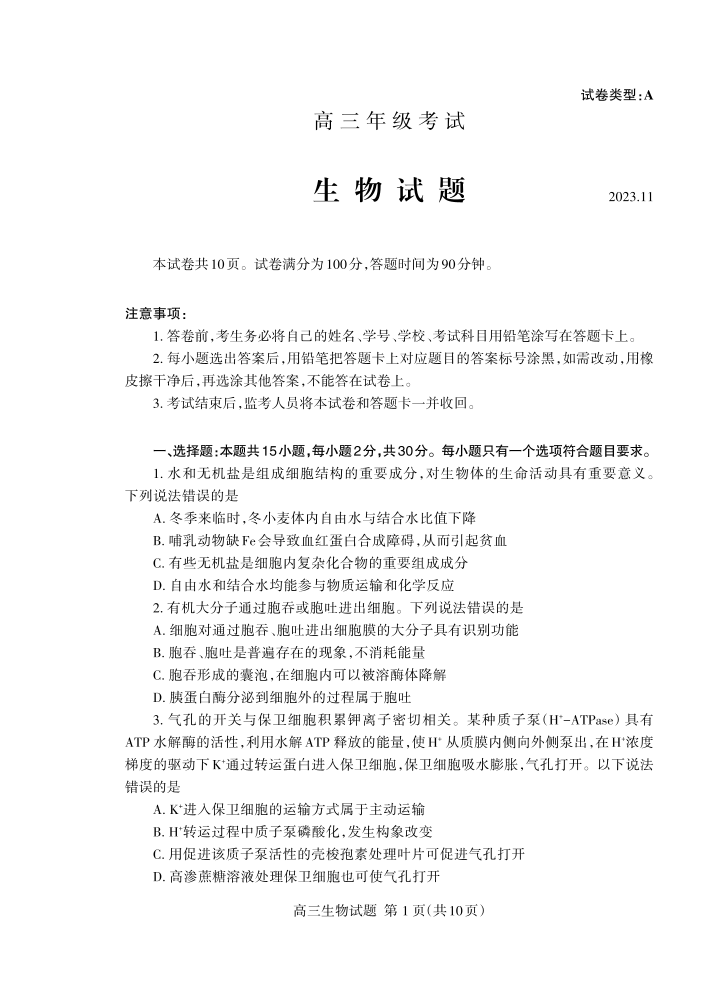 山东省泰安市2024届高三上学期期中考试生物