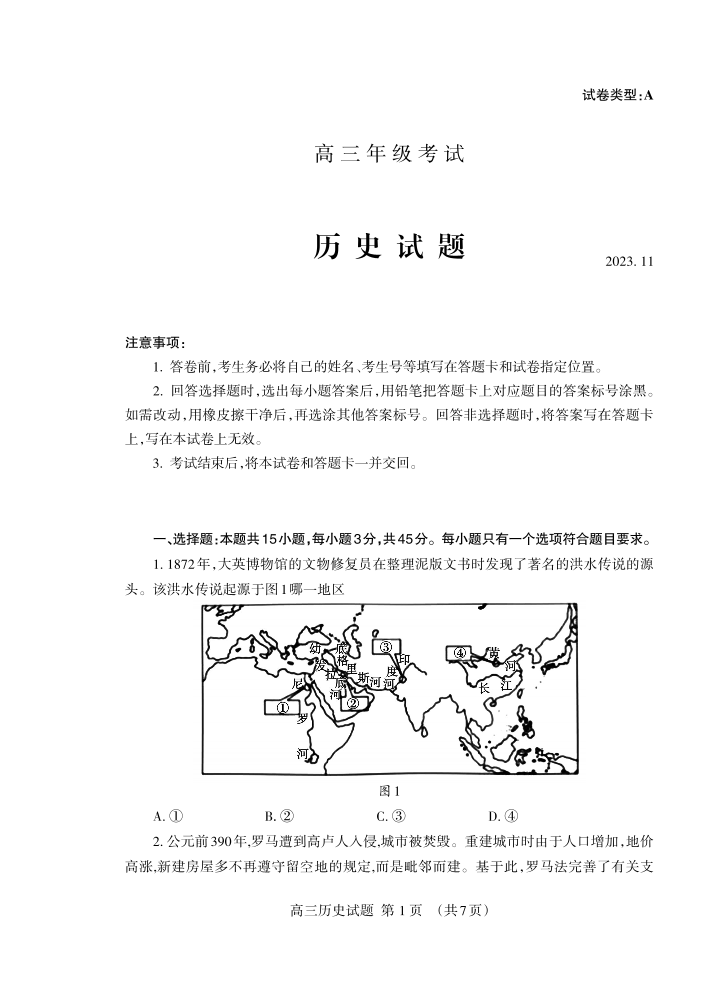 山东省泰安市2024届高三上学期期中考试历史