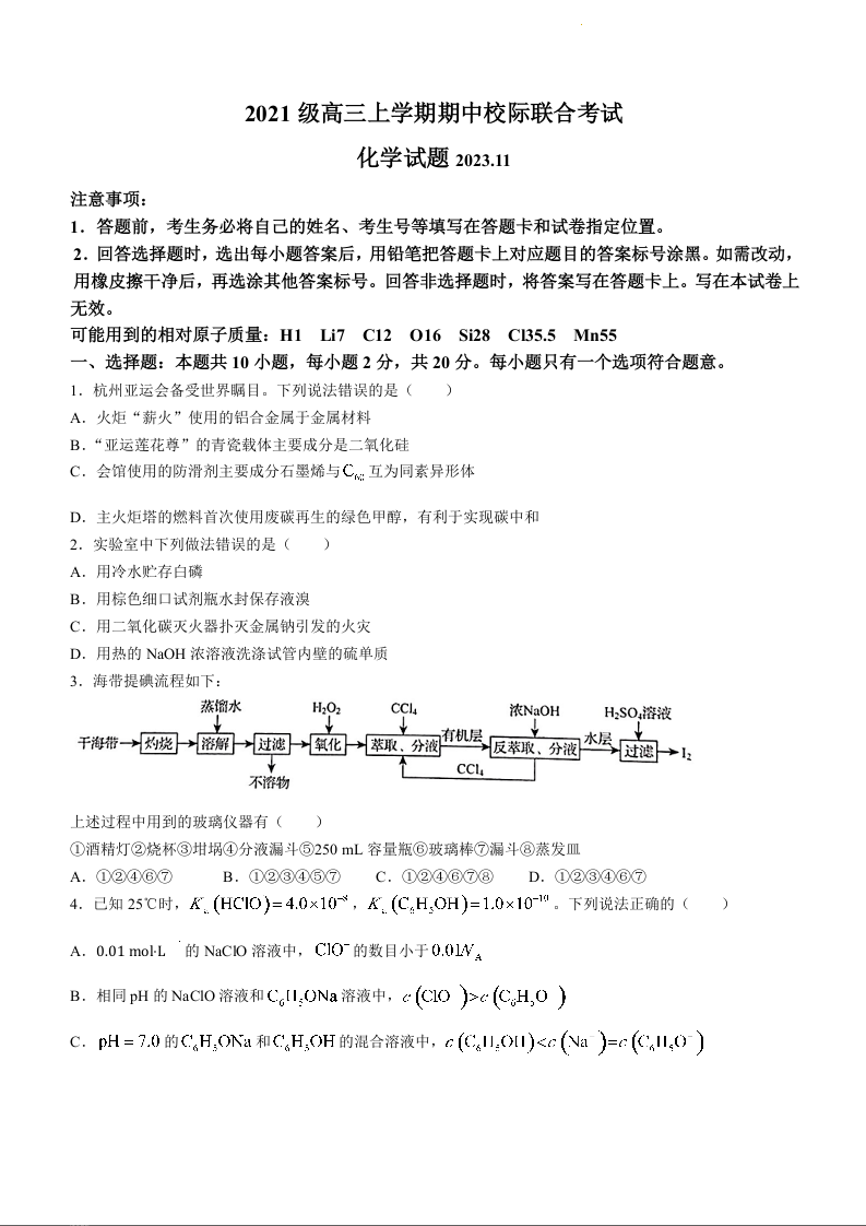 山东省日照市2024届高三上学期期中考试化学+答案