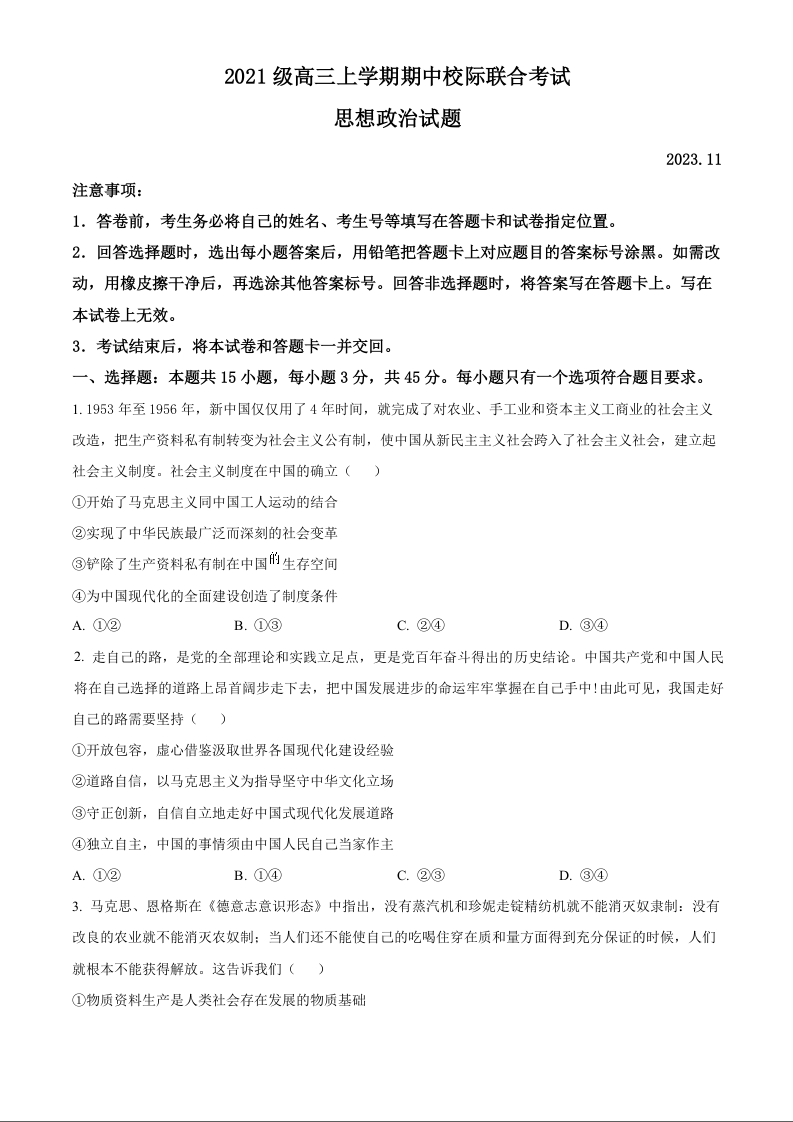 山东省日照市2024届高三上学期期中考试政治+答案