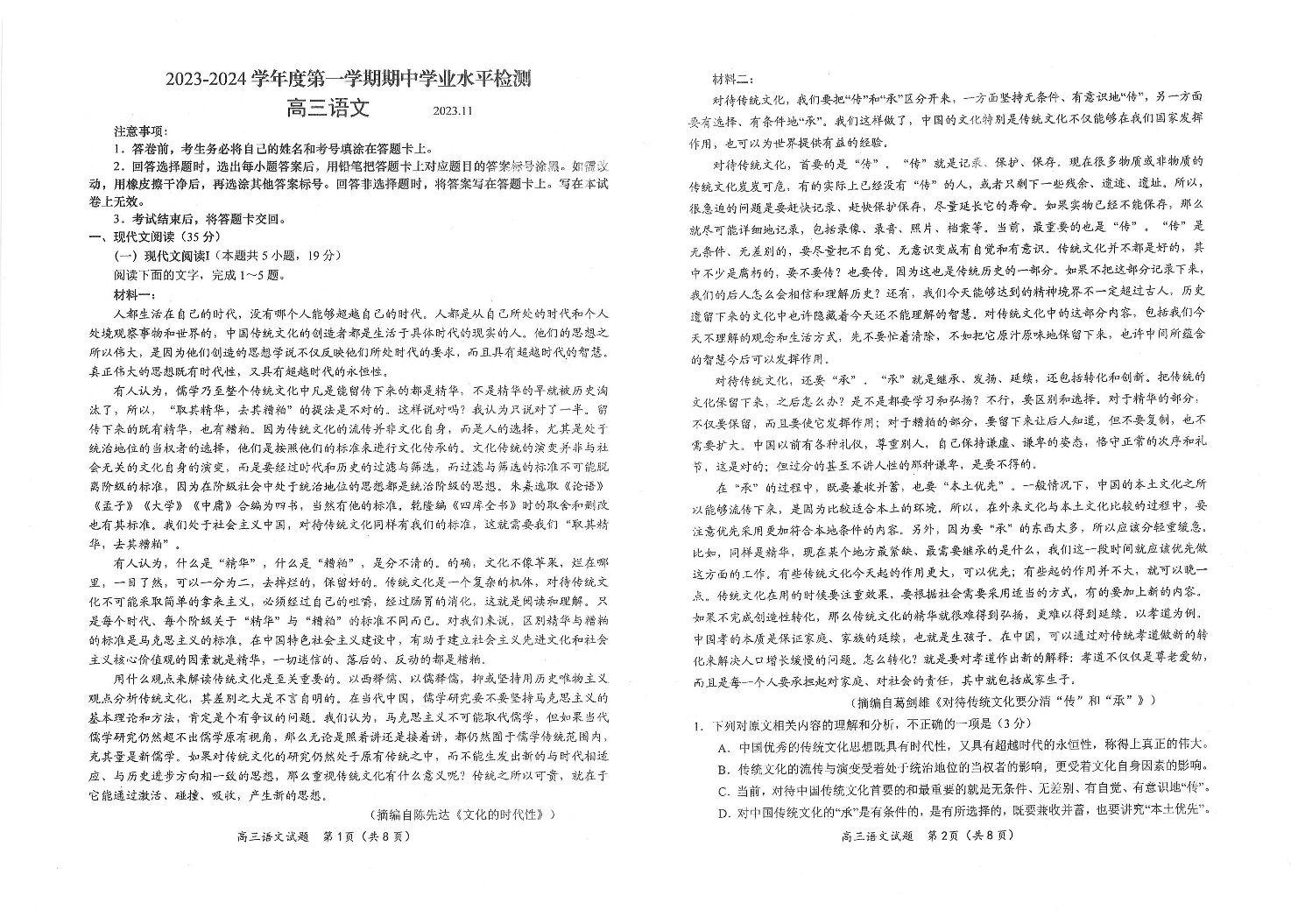 山东省青岛市四区统考2024届高三上学期期中语文