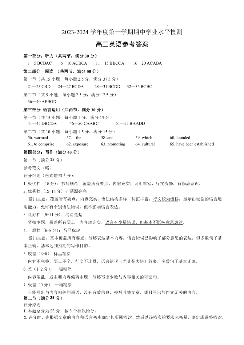山东省青岛市四区统考2024届高三上学期期中英语答案