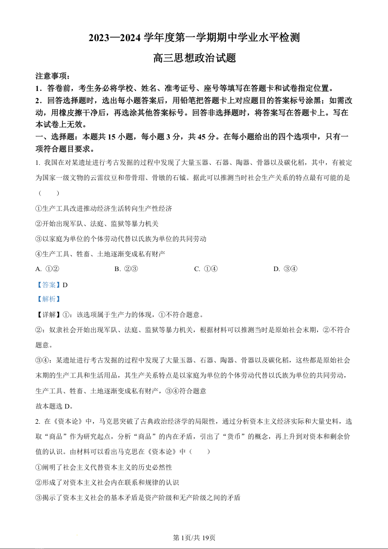 山东省青岛市四区统考2024届高三上学期期中政治(精品解析版)