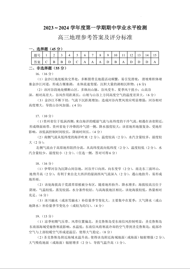 山东省青岛市四区统考2024届高三上学期期中地理答案
