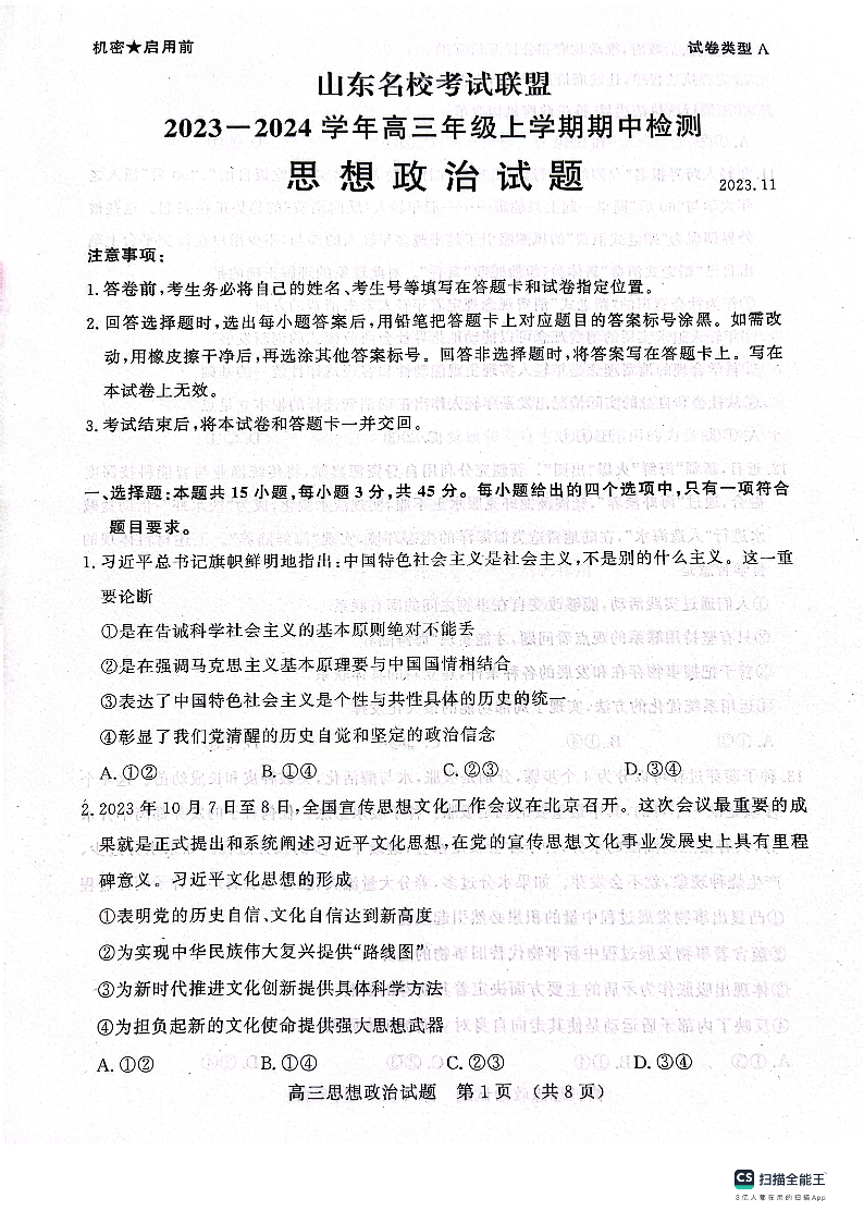 山东省名校考试联盟2024届高三上学期11月期中检测(济南期中)政治