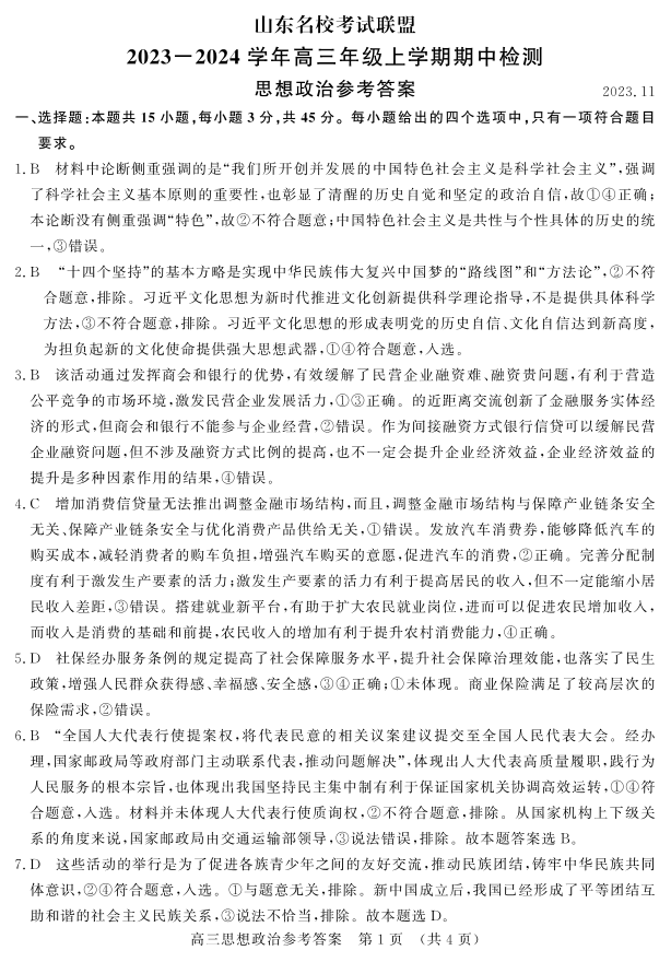 山东省名校考试联盟2024届高三上学期11月期中检测(济南期中)政治答案