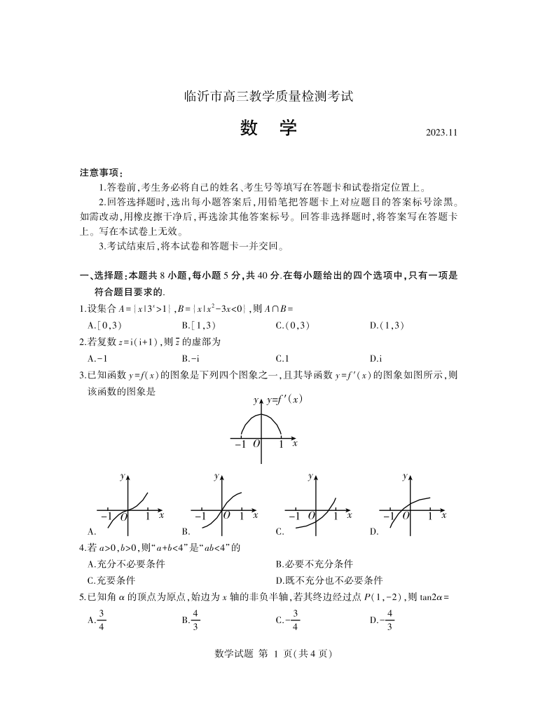 山东省临沂市2024届高三11月教学质量检测考试数学