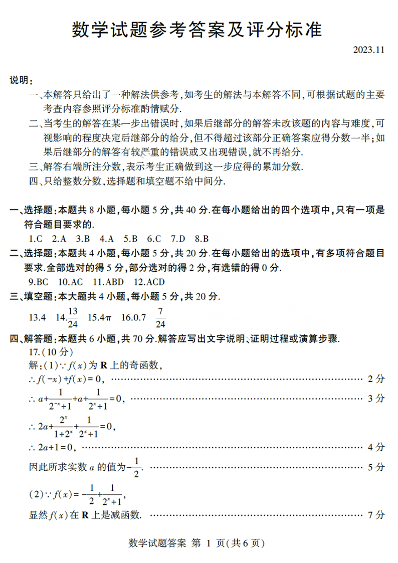 山东省临沂市2024届高三11月教学质量检测考试数学答案