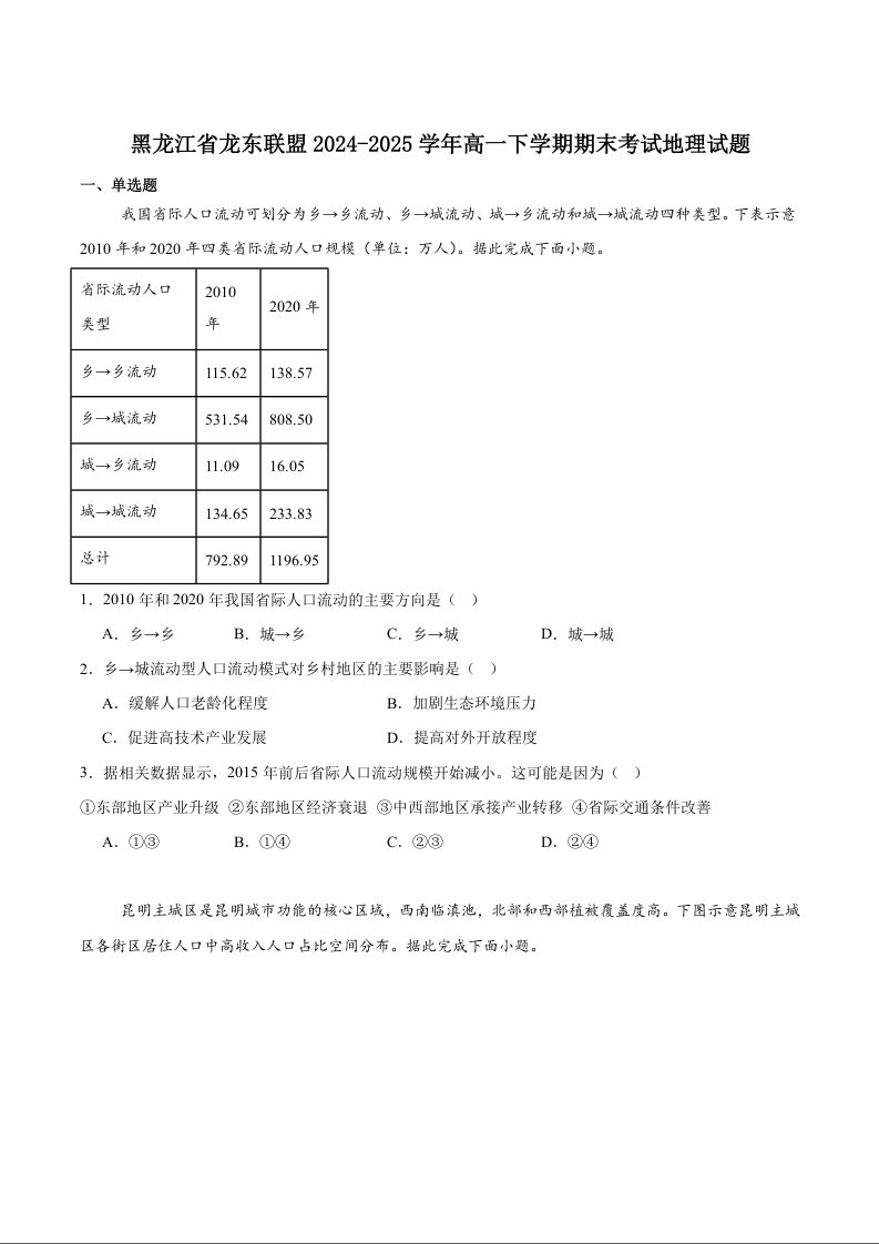 高一地理+答案--黑龙江省龙东联盟2024-2025学年高一下学期期末考试