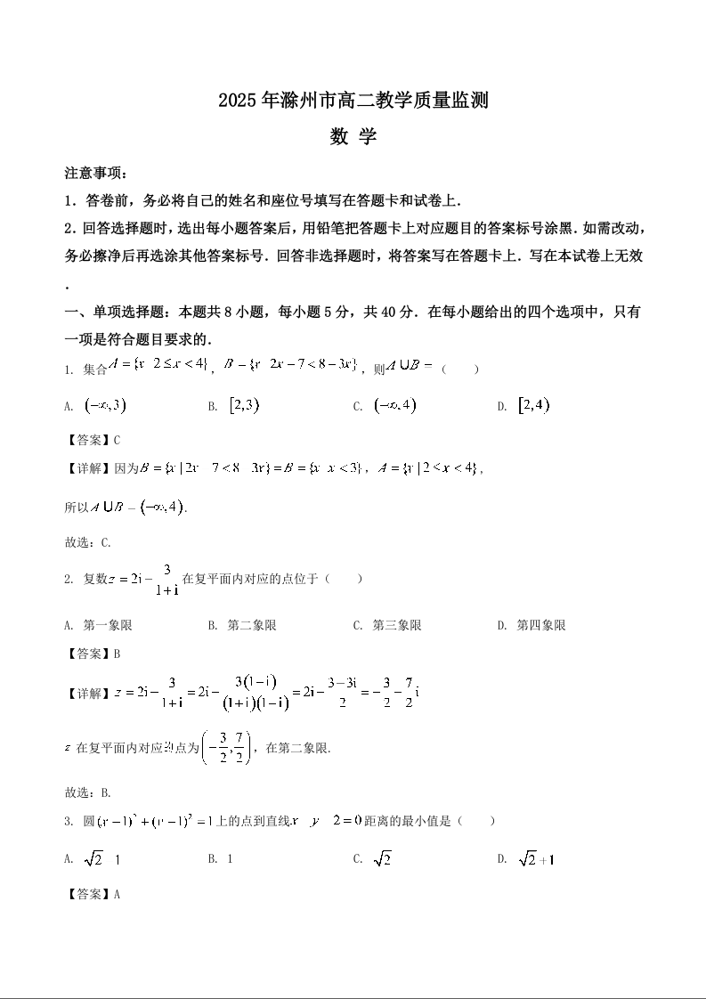 高二数学+答案--安徽省滁州市2024-2025学年高二下学期期末考试