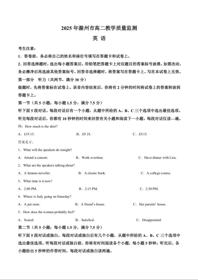 高二英语+答案--安徽省滁州市2024-2025学年高二下学期期末考试
