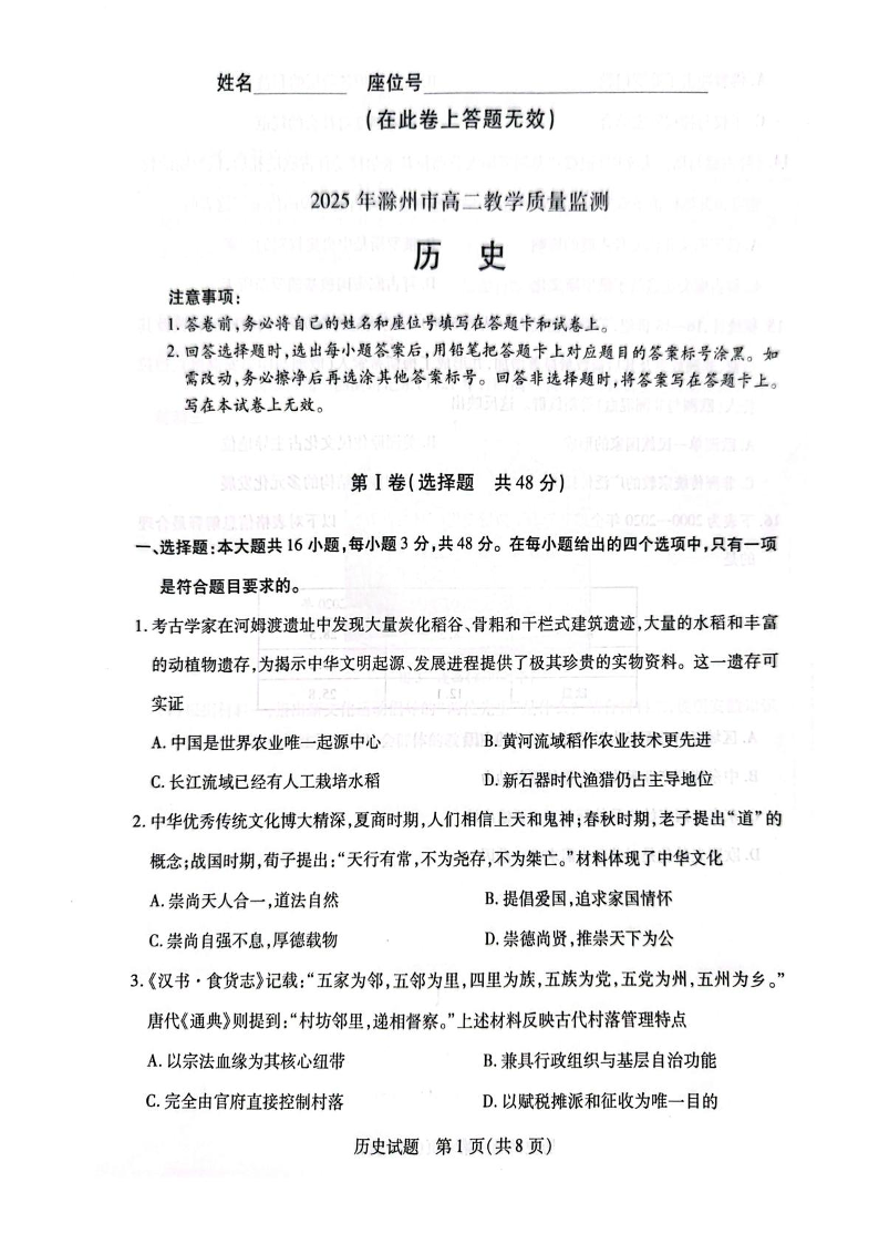 高二历史+答案--安徽省滁州市2024-2025学年高二下学期期末考试