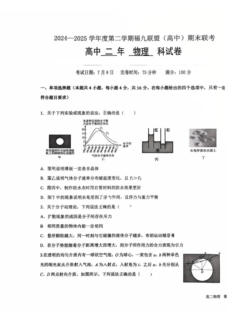 高二物理+答案--福建省福州市福九联盟2024-2025学年高二下学期7月期末考试