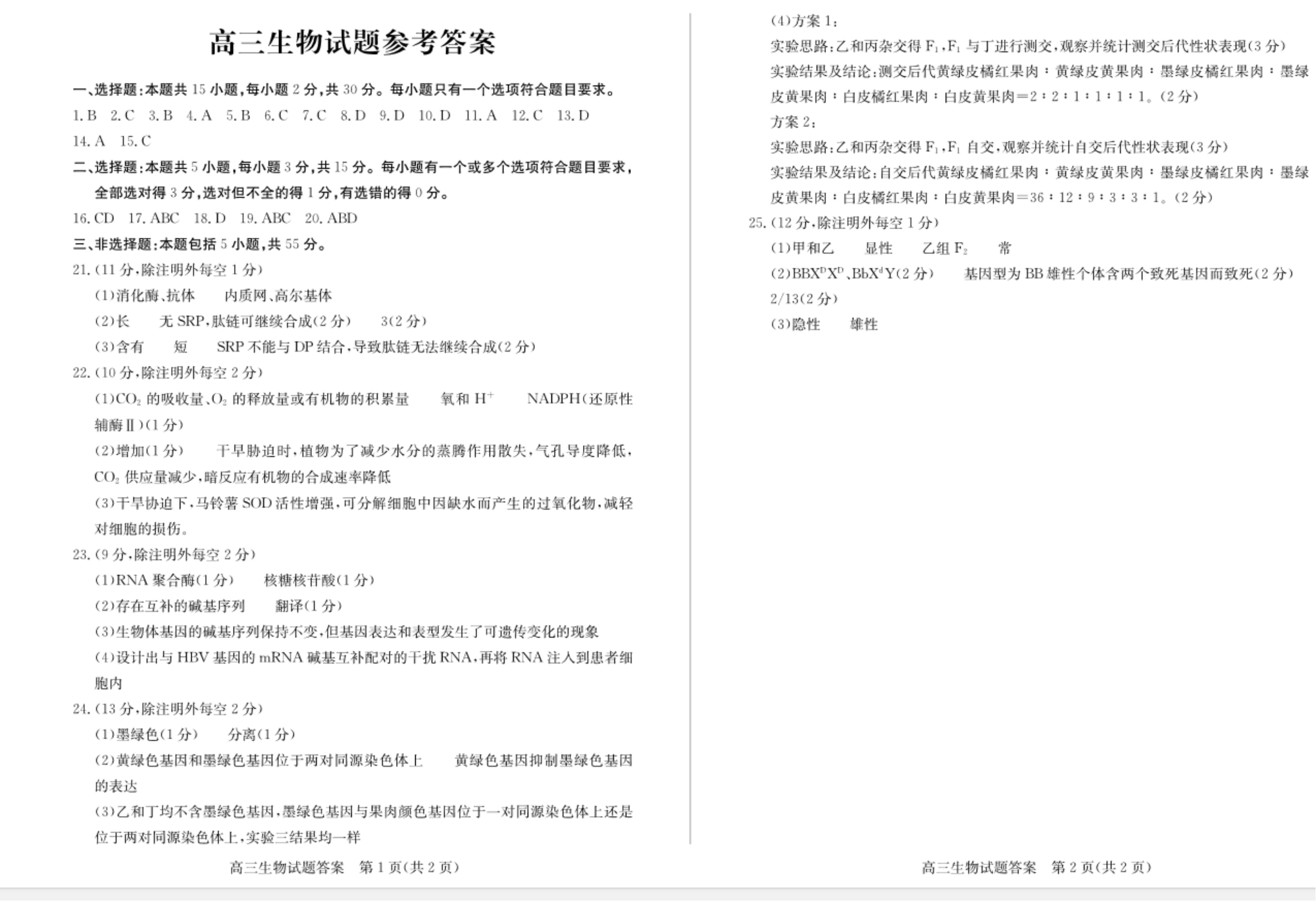 山东省德州市优高联考2024届高三上学期期中考试生物答案