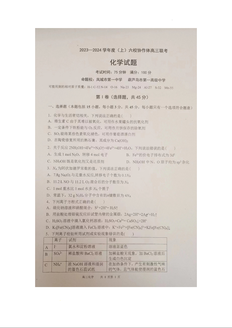 辽宁省六校协作体2024届高三上学期11月期中考试化学