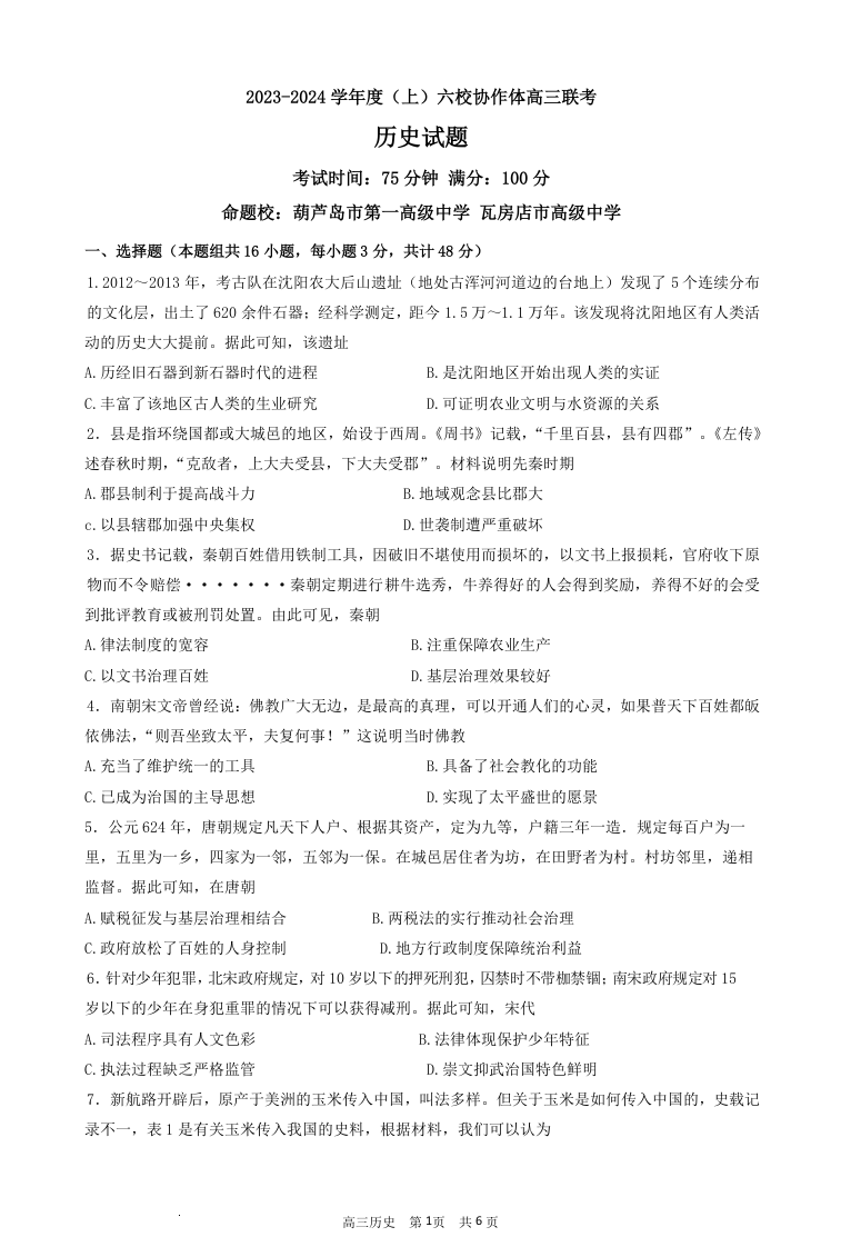 辽宁省六校协作体2024届高三上学期11月期中考试历史