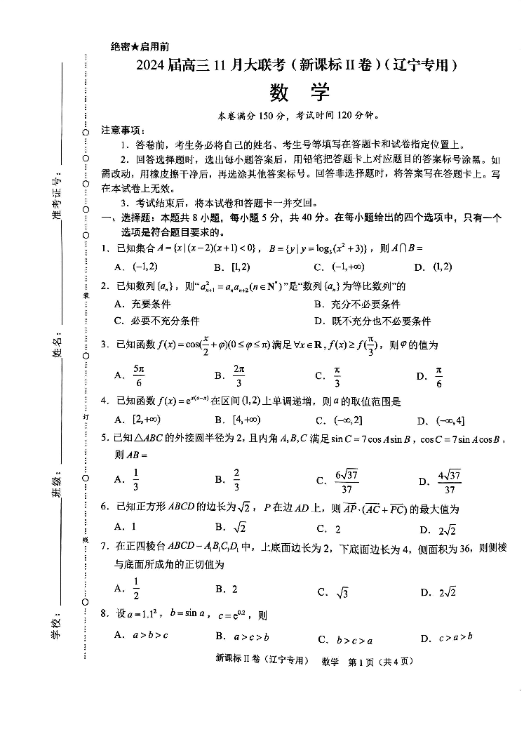 辽宁省2024届高三11月半期大联考(辽宁专用)数学