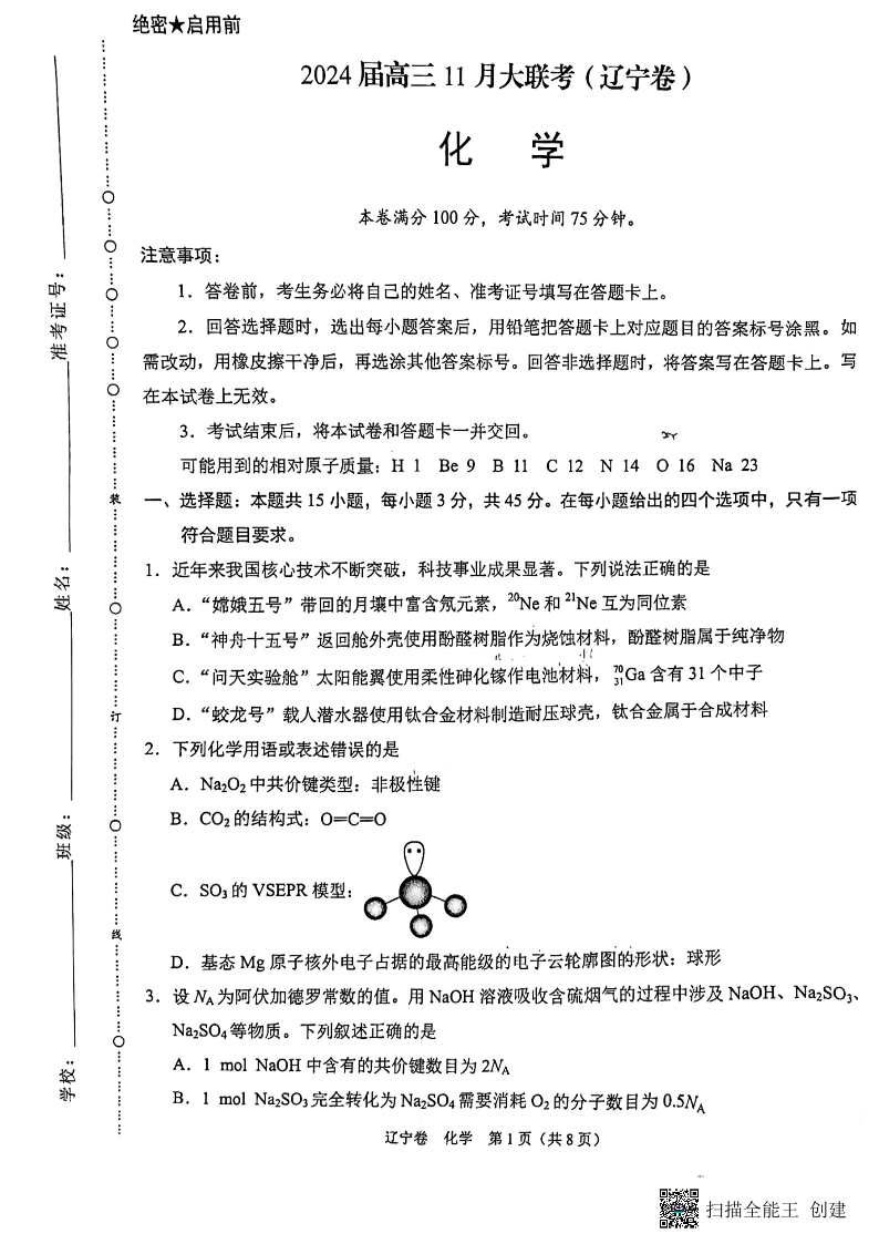 辽宁省2024届高三11月半期大联考(辽宁专用)化学