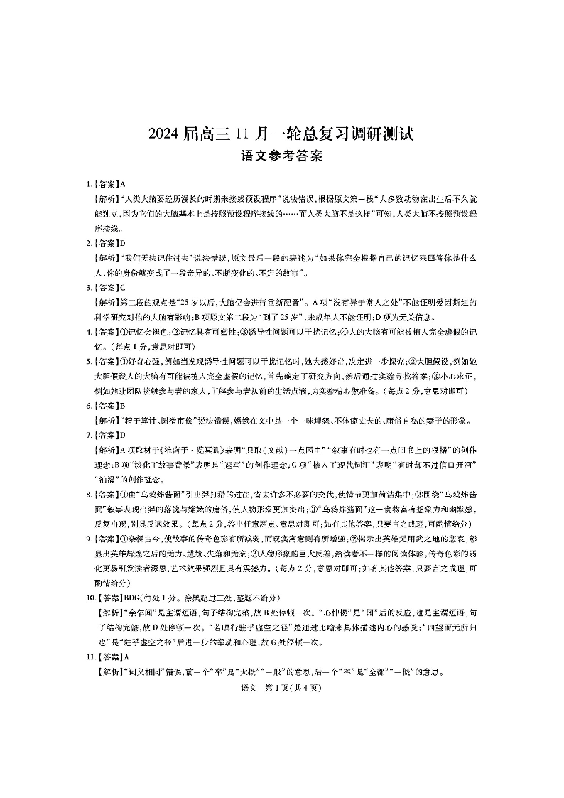 江西省稳派2024届高三上学期11月一轮总复习调研测试语文答案