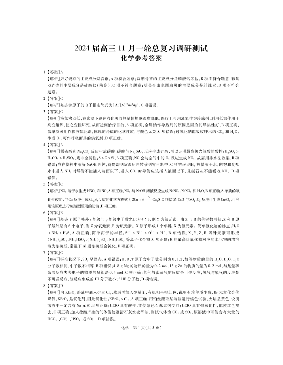 江西省稳派2024届高三上学期11月一轮总复习调研测试化学答案