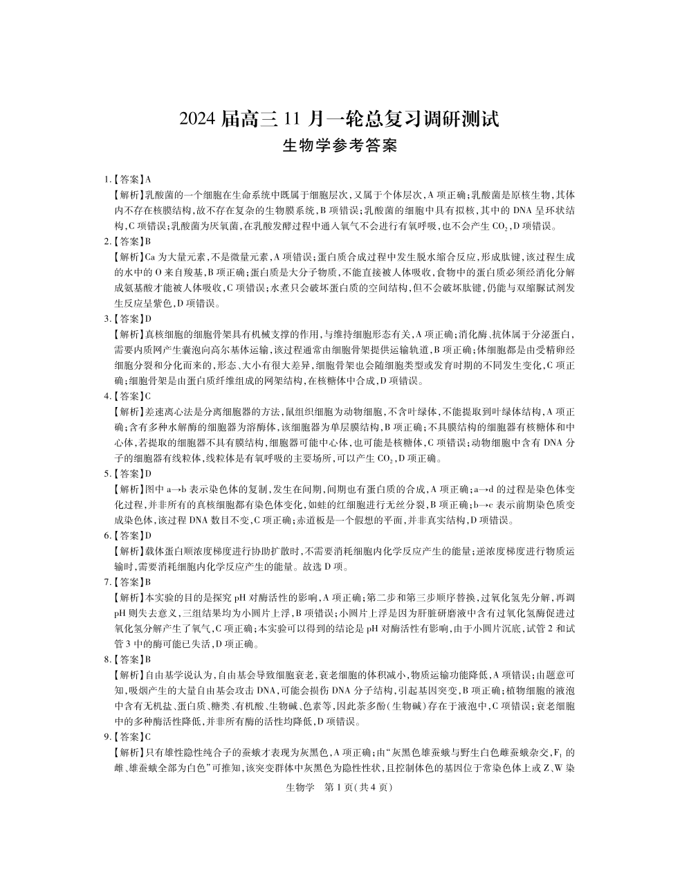 江西省稳派2024届高三上学期11月一轮总复习调研测试生物答案