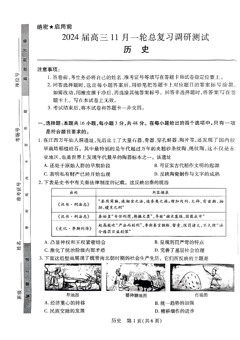 江西省稳派2024届高三上学期11月一轮总复习调研测试历史