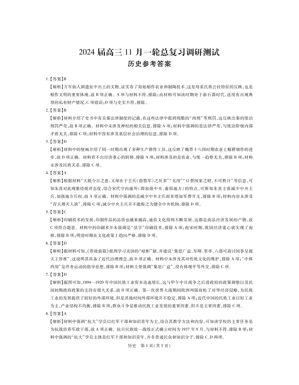 江西省稳派2024届高三上学期11月一轮总复习调研测试历史答案