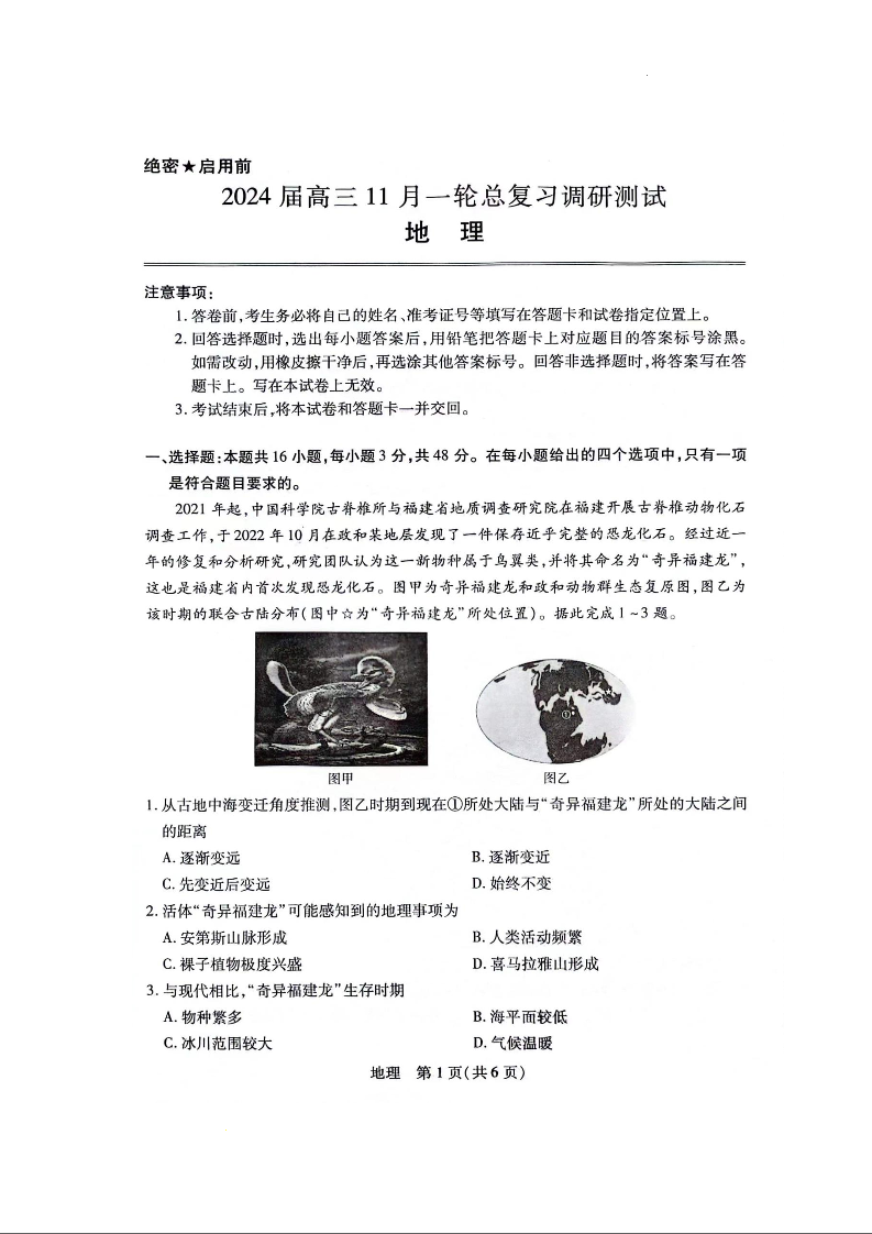 江西省稳派2024届高三上学期11月一轮总复习调研测试地理