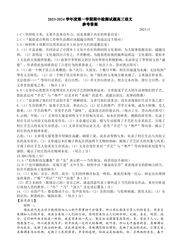 江苏省扬州市2024届高三上学期11月期中检测语文答案