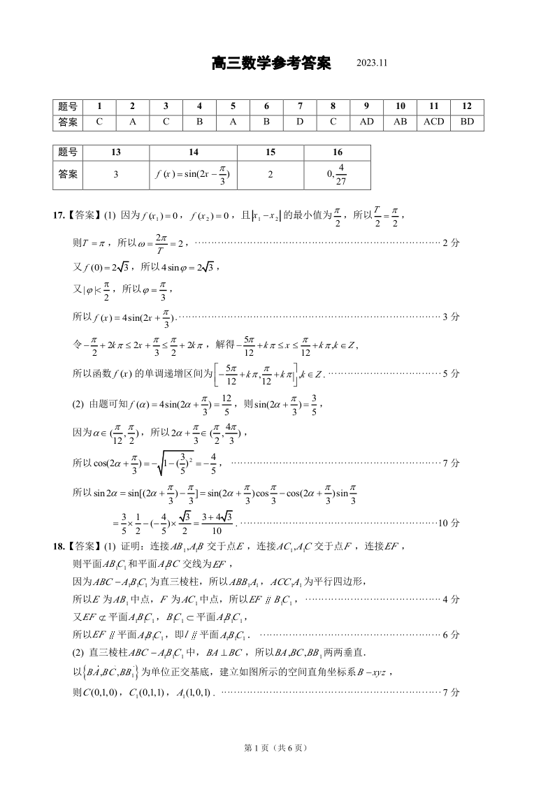 江苏省扬州市2024届高三上学期11月期中检测数学答案