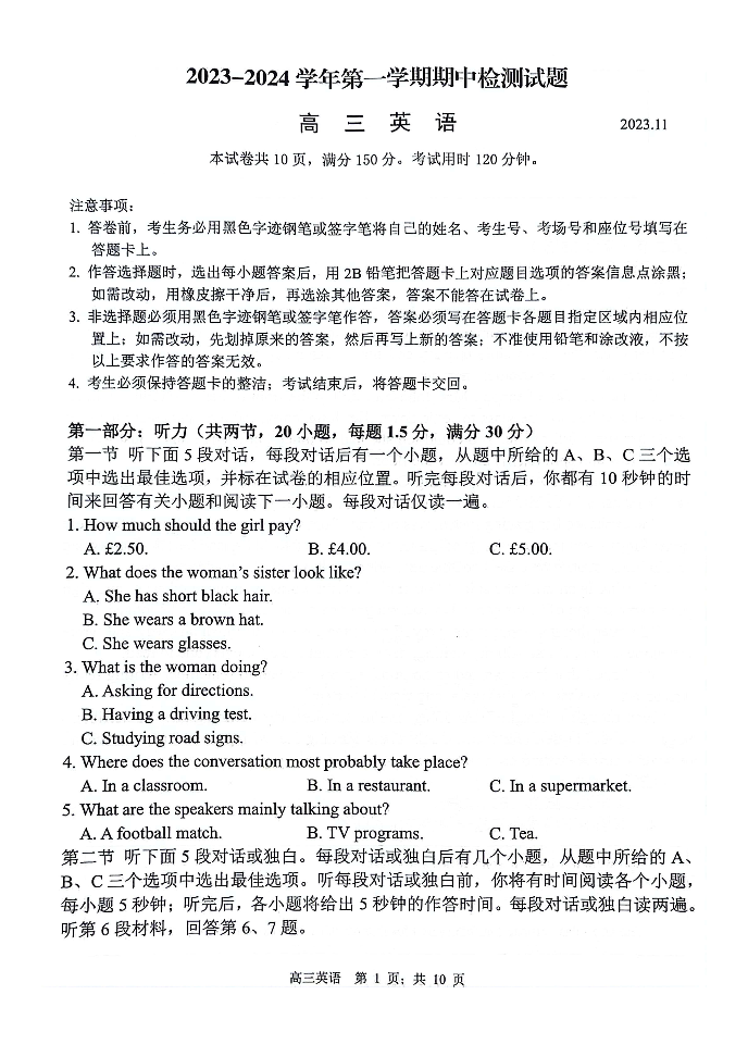 江苏省扬州市2024届高三上学期11月期中检测英语