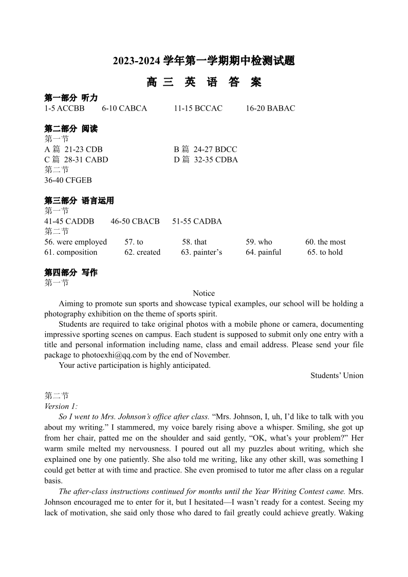 江苏省扬州市2024届高三上学期11月期中检测英语答案