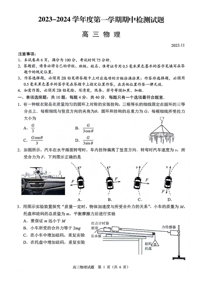 江苏省扬州市2024届高三上学期11月期中检测物理