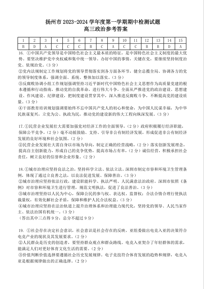 江苏省扬州市2024届高三上学期11月期中检测政治答案