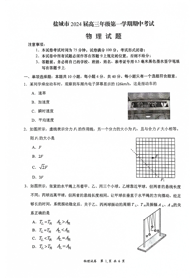 江苏省盐城市2024届高三上学期期中考试物理+答案