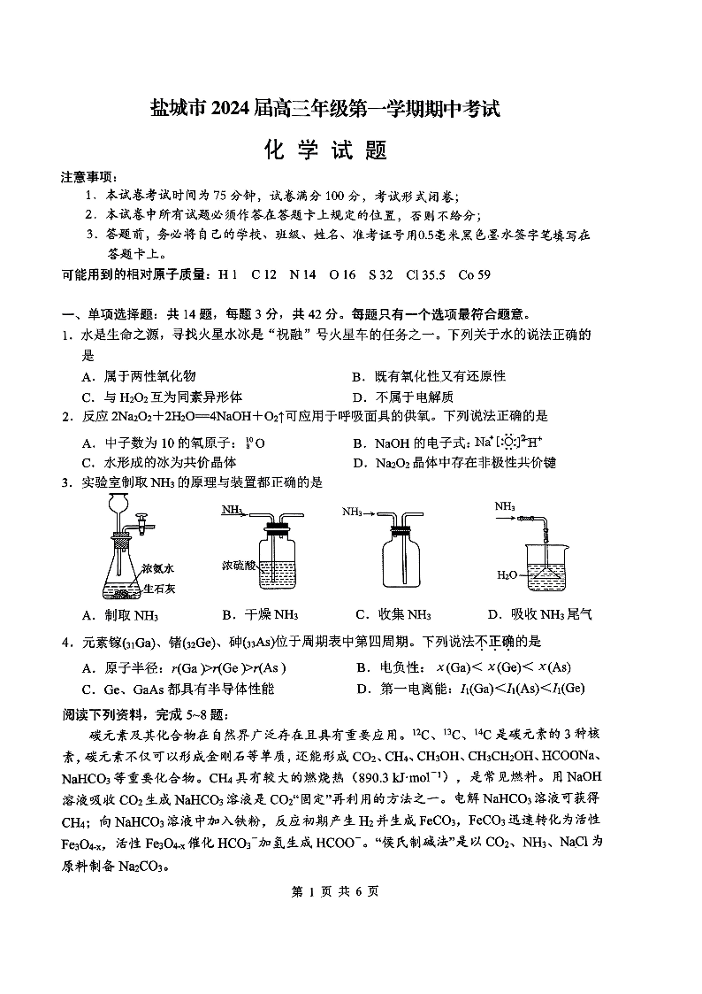 江苏省盐城市2024届高三上学期期中考试化学+答案